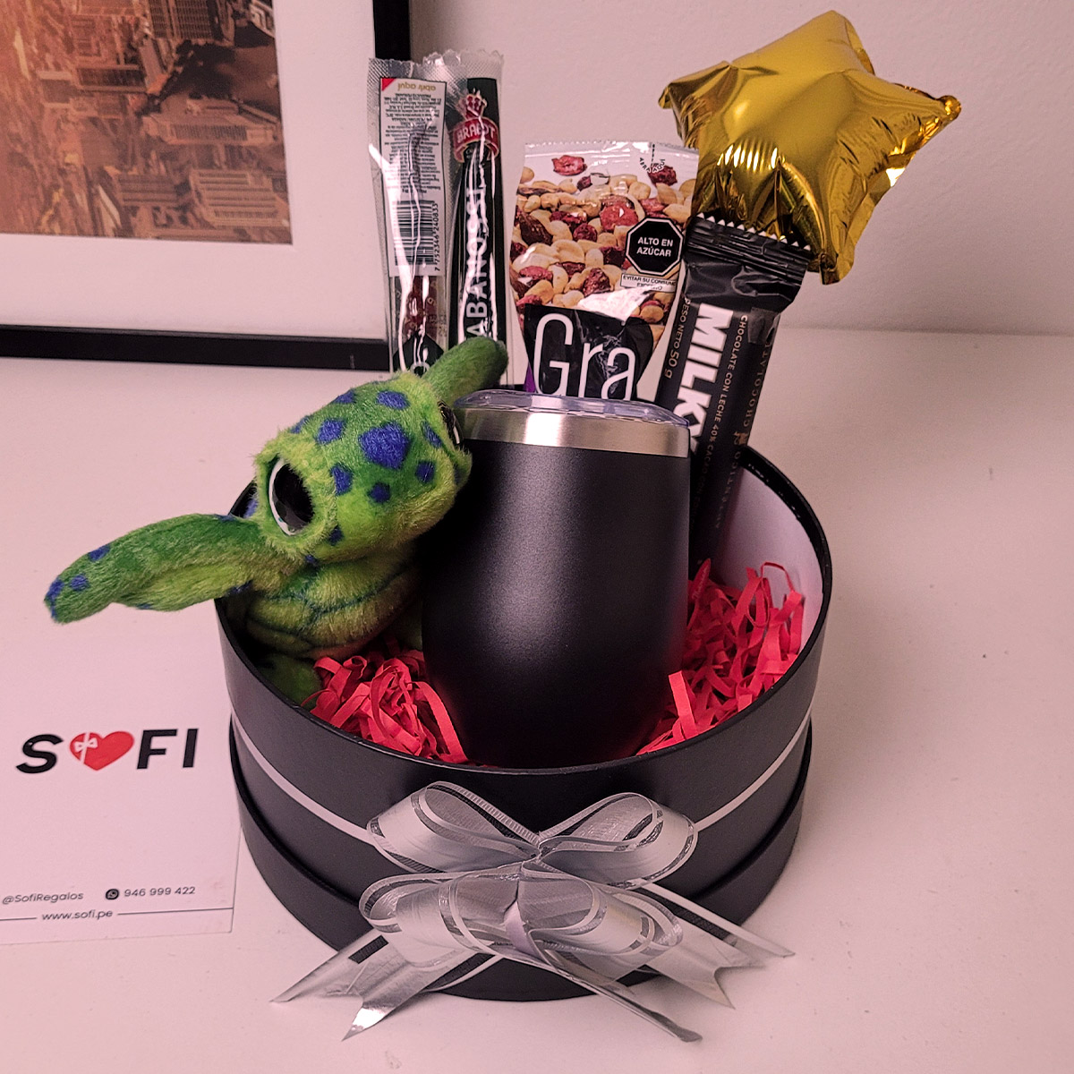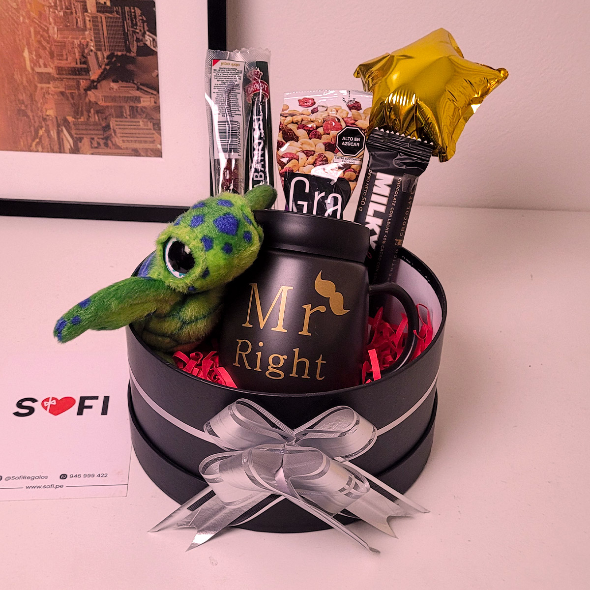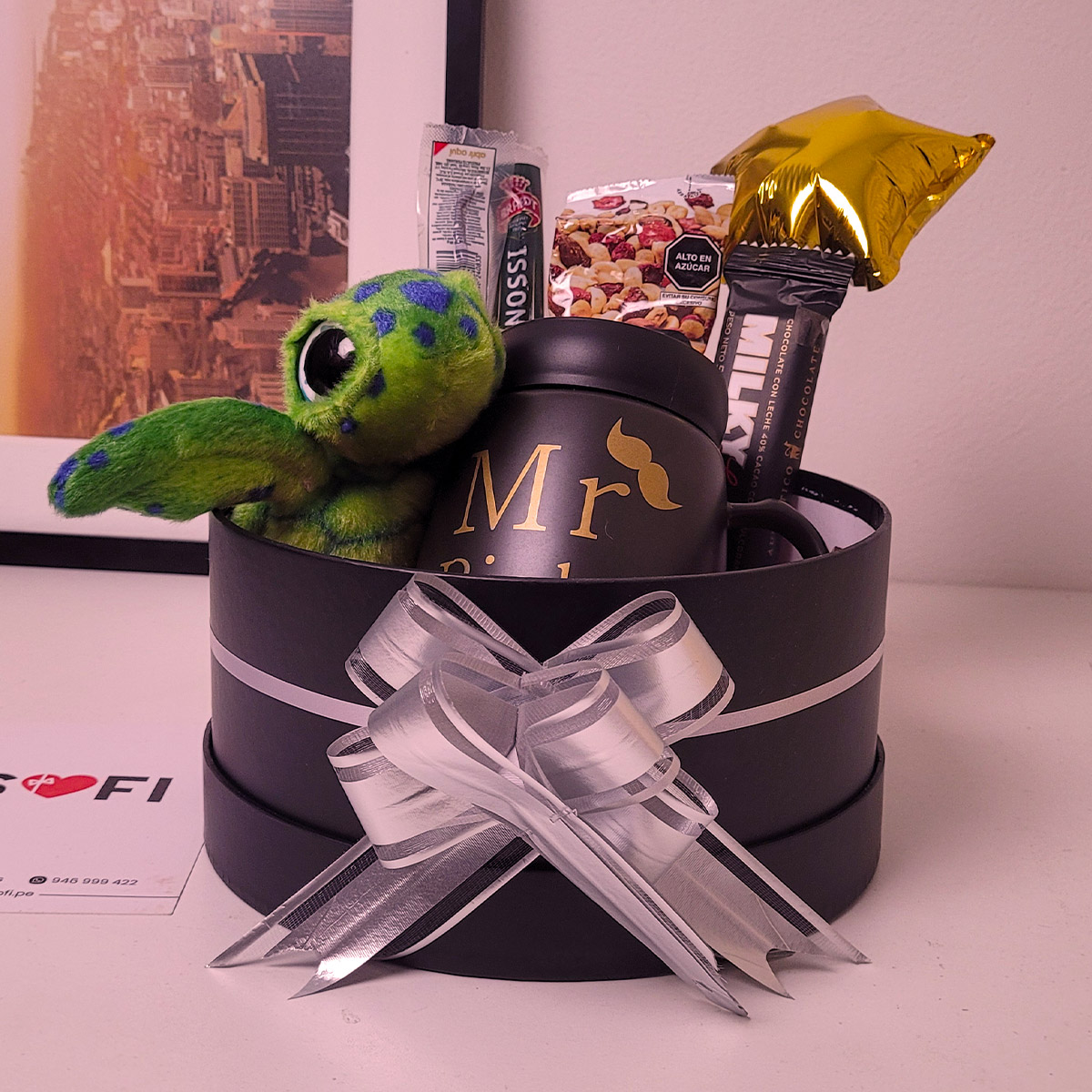 Regala a tu amigo o novio este lindo regalo personalizado para hombre con taza, chocolate, cabanossi, peluche y maní con arándanos. Ideal para celebrar su cumpleaños, San Valentín y el Día del Padre.